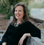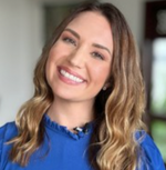 Smiling woman holding a pink massage device, wearing a patterned scarf.